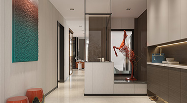 入戶玄關,是日常出入最重要的地方。推門進來,首先映入眼簾的墻面,可以說是家的顏值擔當。玄關的用作從審美的角度看,玄關的設計,能對居室起到一定的美化和裝飾作用,表現(xiàn)了主人的文化修養(yǎng)和藝術品位。海創(chuàng)輕奢玄關設計,香檳色金屬線條利落有致,錯層燈帶營造既滿足視覺感受,又具有一定的照明需求??臻g質(zhì)感與藝術感不言而喻。從風水角度看,玄關能夠讓住家藏風聚氣,化解“開門見廳”這一布局缺陷,也有很好的擋煞和化煞的作用,并防止旺氣外泄。海創(chuàng)新中玄關隔而不斷,開門見綠,營造了整體大氣卻不失精致感的雅致韻味。柜體隔斷也是一種方式。它既能提升家的顏值,又為家打造了一個功能區(qū),還可以解決鞋柜的擺放問題,增加收納空間。玄關的類型入戶玄關入戶玄關指的是剛進門的那段過渡空間。家里裝修設計好不好,玄關作為“第一眼之美”就起到了畫龍點睛的作用。海創(chuàng)現(xiàn)代入戶玄關背景墻,愛馬仕橙搭配巖紋,質(zhì)感細膩、活力滿滿。海創(chuàng)入戶玄關背景墻采用開門見畫的點綴方式,大方得體。高品質(zhì)板材搭配利落線條,造型別致且錯落有序,彰顯出獨特的魅力過道玄關過道玄關,在很多人眼中,有很明顯的缺陷,比如路徑長,可能造成空間浪費,在做玄關時要花點心思排布體塊。玄關作為家中第一道風景線,給人的第一印象也代表了主人的審美和品味。一個好用的玄關能夠提高人們的家居幸福感,同樣也需要我們用心設計哦~more+