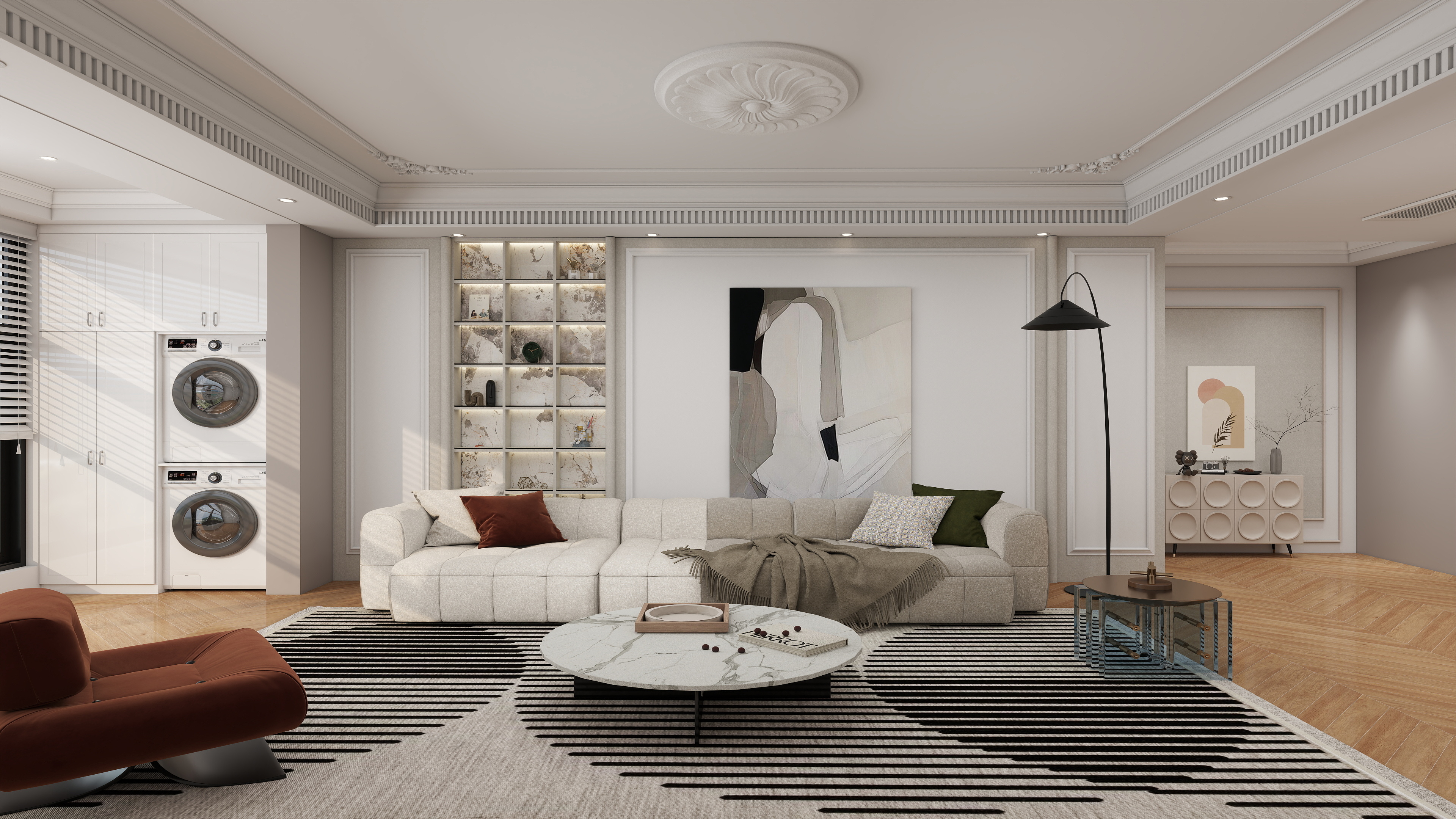 本案以170㎡的敞闊空間為畫卷,執(zhí)筆隱奢極簡的設(shè)計(jì)哲學(xué),為您勾勒一處身心皆安的品質(zhì)居所。我們秉持健康環(huán)保理念,通過頂、墻、門、柜的一體化整合設(shè)計(jì),摒棄冗余裝飾,讓家的每一寸空間都流淌著舒適與寧靜。步入一體化客餐陽區(qū)域,視野豁然開朗。電視背景墻與沙發(fā)背景墻對向而立,與微復(fù)式結(jié)構(gòu)共同撐起大宅氣度。陽臺休閑區(qū)巧妙嵌入,無論是午后品茗還是與友麻將,皆成忙里偷閑的愜意時(shí)光。L型轉(zhuǎn)角廚房動線流暢,與圓桌餐廳形成完美互動;餐廳一側(cè),半開放式奢石餐邊柜成為視覺焦點(diǎn),天然的紋理與溫潤的木色相映成趣,在簡約中暗藏奢華質(zhì)感。私密區(qū)域同樣匠心獨(dú)運(yùn)。兒童房將書桌、衣柜與睡眠區(qū)一體化定制,功能完備且渾然天成,助力孩子專注學(xué)習(xí)與健康成長。主臥與次臥延續(xù)靜謐格調(diào),一門到頂?shù)囊鹿翊钆錁O簡拉手設(shè)計(jì),線條利落純粹,在擴(kuò)大收納空間的同時(shí),極大提升了視覺上的延伸感,營造出令人放松的睡眠環(huán)境。全案通過高級木飾面、定制系統(tǒng)柜與奢石元素的極致組合,不止于視覺上的高級大氣,更致力于為您打造一個(gè)從身體到心靈都倍感健康、安舒與從容的理想家。more +11月