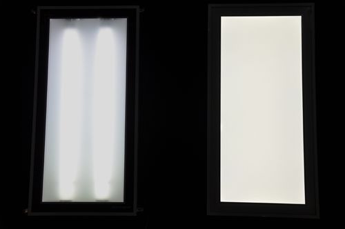 照明對(duì)比:左為琥珀系列節(jié)能燈產(chǎn)品,右為琥珀系列LED純屏燈產(chǎn)品