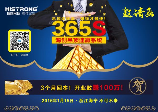 3個(gè)月回本開業(yè)敢賺100萬,高端定制,頂層生活!2016年1月15日相約浙江海寧,海創(chuàng)吊頂速贏系統(tǒng)發(fā)布會(huì)竭誠(chéng)邀請(qǐng)您參加,共贏美好未來,財(cái)富熱線:400 114 0333。
