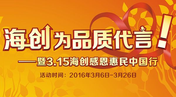 在3.15國際消費者權(quán)益日來臨之際,海創(chuàng)集成吊頂特推出以“海創(chuàng),為品質(zhì)代言!”為主題的特惠活動,活動時間從2016年3月6日至3月26日,海創(chuàng)全國專賣店感恩回饋大放送!