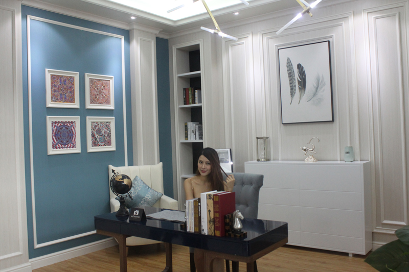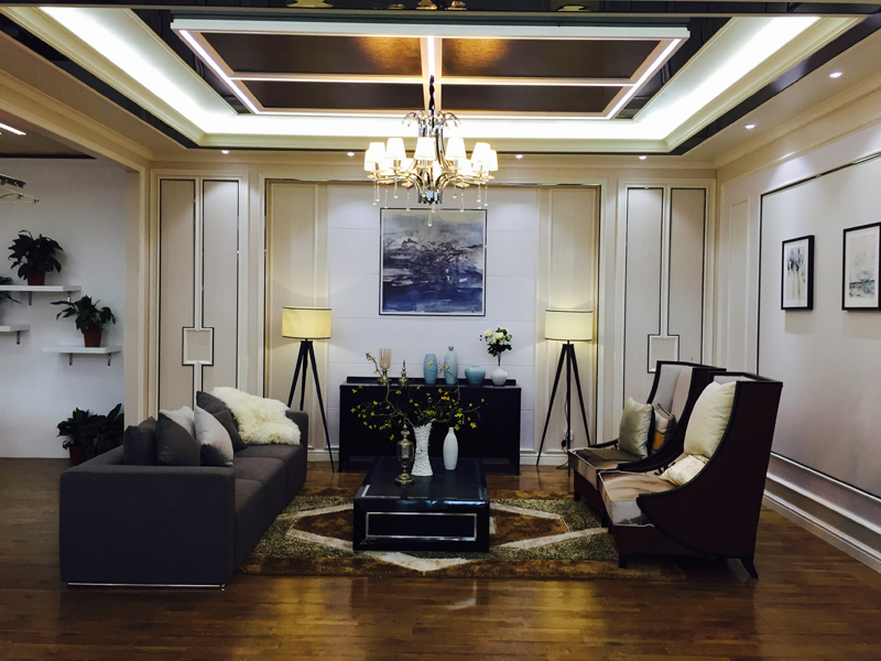 離開臥室,迎面可見視野開闊的海創(chuàng)客廳情景展示區(qū),黑白對(duì)比墻頂設(shè)計(jì)淺藏東方居家哲學(xué),敞亮空間搭配淡雅水墨氣質(zhì)軟裝物品,將“頂墻一體”整體定制表現(xiàn)得淋漓盡致。