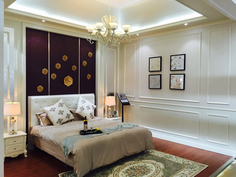 繼續(xù)往前行走,舒適的臥室情景展示一目了然。紫紅竹木裝飾背景墻面搭配金色玫瑰鑲金浮雕,高貴臥室氣息撲面而來!