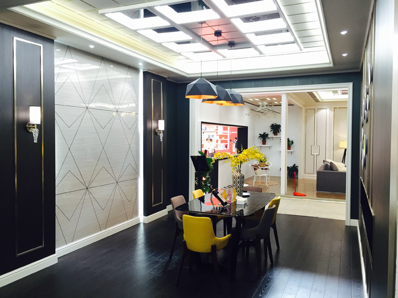 餐廳情景展示區(qū)緊鄰廚房,以奢華大氣迅速奪人眼球,多角菱形線框與黃色花束交相輝映,在RIO酒的共同陪襯下生發(fā)香甜的居家美味,美食之旅頓時(shí)開啟。