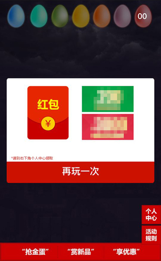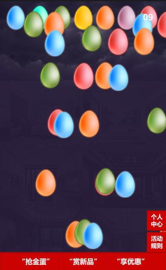 第二步:進入游戲界面后,選擇“搶金蛋”板塊點擊進入,將有大量金蛋飄下,請以最快速度點擊搶奪,搶到的金蛋數(shù)越多,中獎率越高。