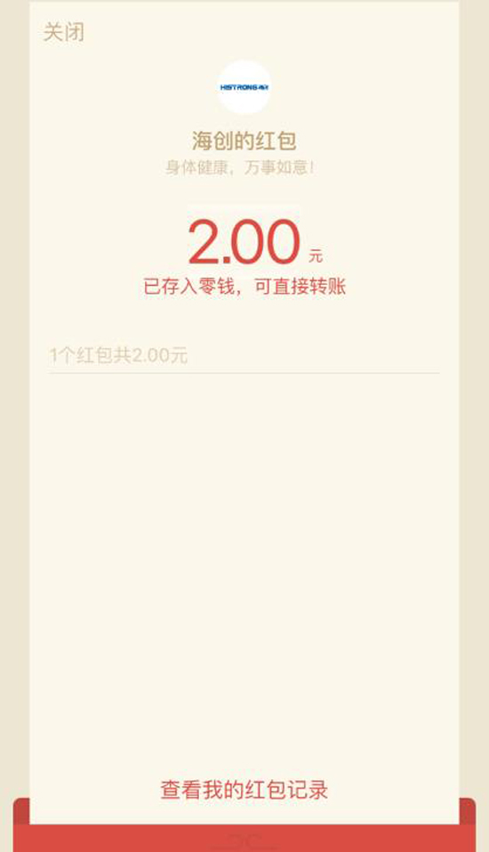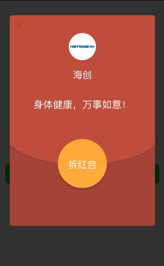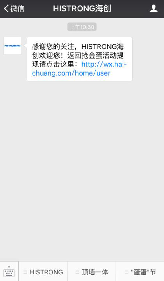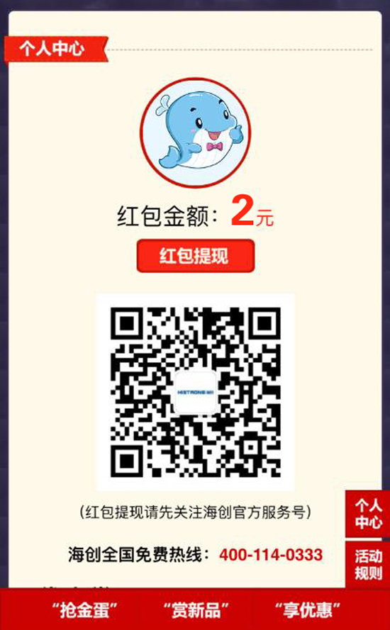 第三步:金蛋飄落結(jié)束后,將顯示獲獎結(jié)果。如獲得現(xiàn)金紅包,在關(guān)注服務(wù)號“HISTRONG海創(chuàng)”后可提現(xiàn)領(lǐng)取。如獲得代金券,可在線下任意一家海創(chuàng)專賣店內(nèi)使用。