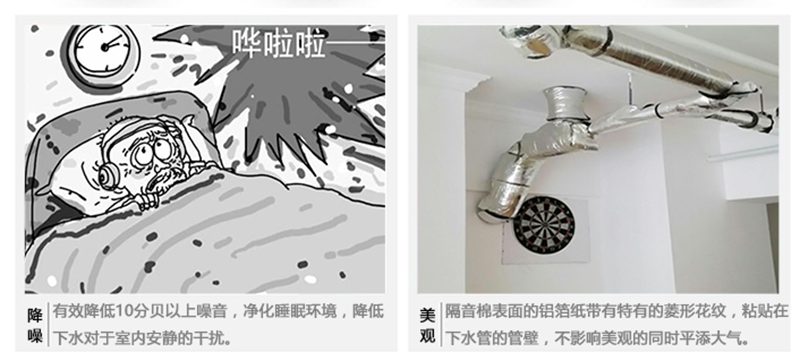 隔音棉產(chǎn)品為吸音波峰海綿、阻尼隔音氈材料的組合,外層為鋁箔。這三種材料組合可以達(dá)到最佳的隔音效果,同時(shí)還具有柔軟,耐曲繞,耐寒,耐熱,阻燃,防水,導(dǎo)熱系數(shù)低,減震等優(yōu)良性能,是水管道專用隔音材料。改變了過(guò)去沒(méi)有下水道專用隔音材料,一層一層包裹帶來(lái)的施工麻煩,材料浪費(fèi),外觀粗糙、丑陋,陰暗環(huán)境易滋生霉菌,隔音效果差等方面的弊病,是目前最好的下水管道專用隔音材料。