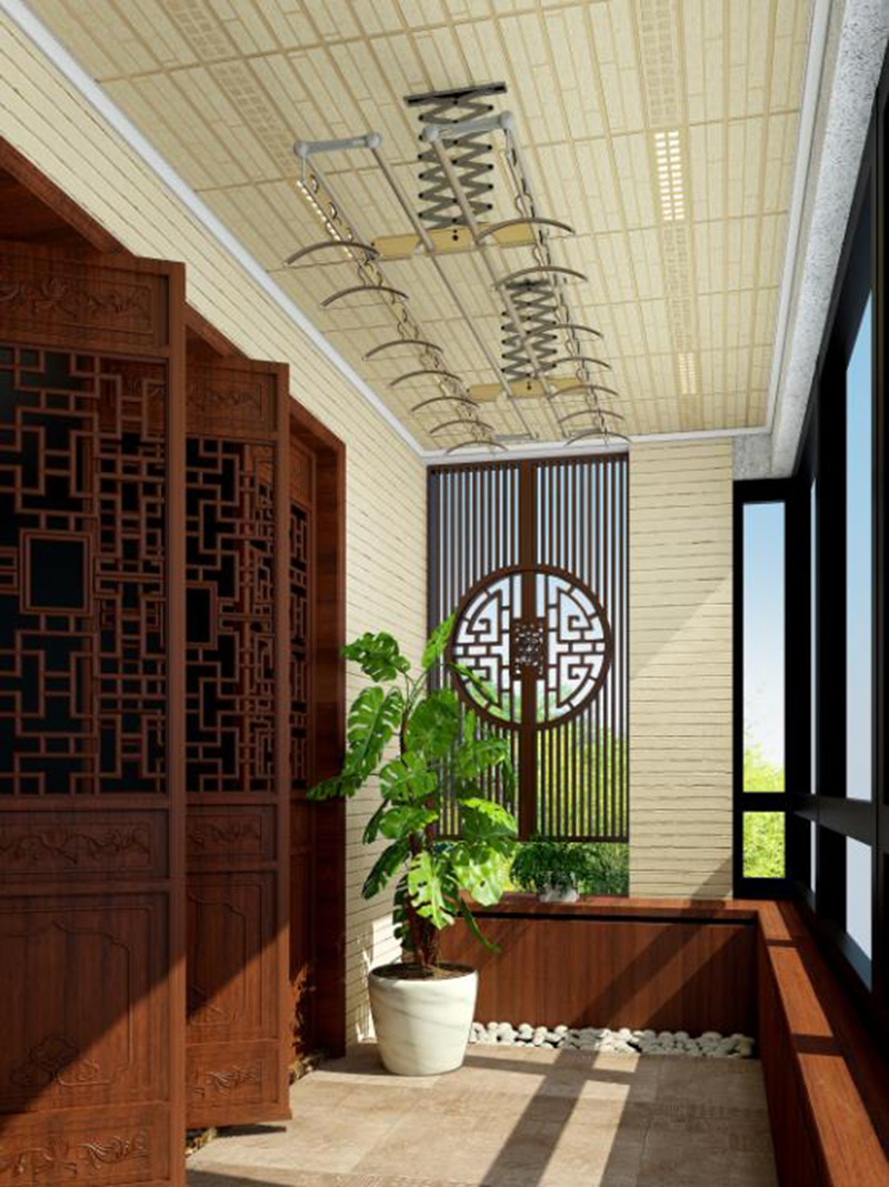 晾衣空間的整潔與否直接決定陽臺空間的美觀度。自電動晾衣架出現(xiàn)之后,上下升降的自由徹底釋放陽臺空間,燈機(jī)一體的構(gòu)造也讓陽臺的整潔性趨向更佳,而與電動晾衣架最相匹配的便是吊頂。陽臺吊頂不僅平衡了安裝晾衣架后造成的頂部不協(xié)調(diào)感,也讓吊頂陽臺可以減少清潔難度,便于日常收拾打掃。