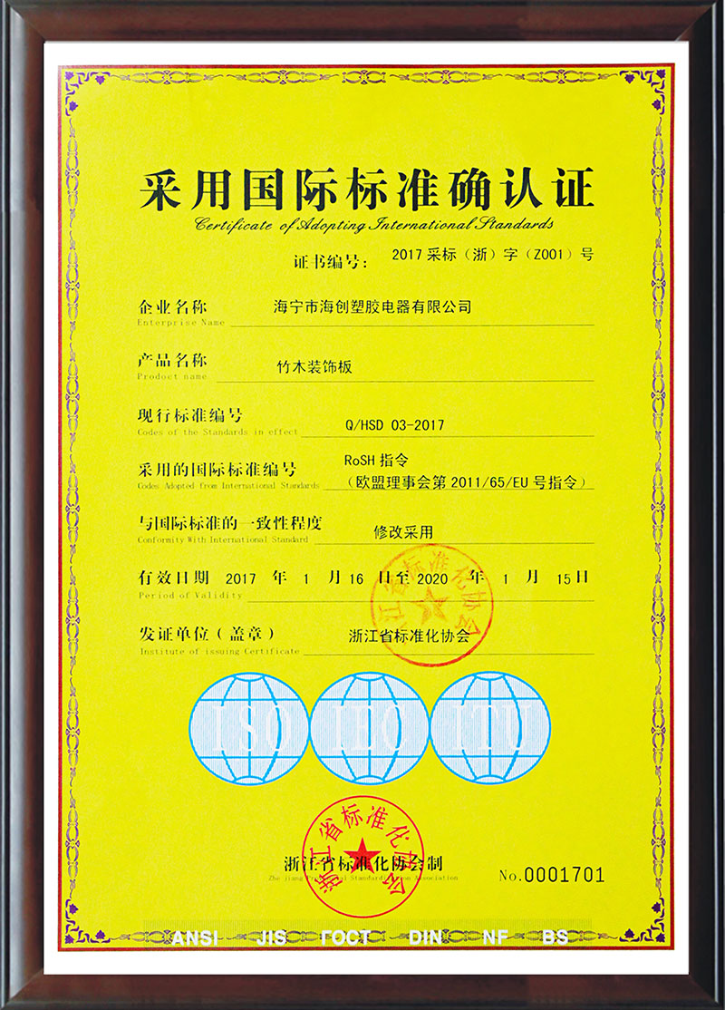 海創(chuàng)竹木裝飾板憑借其優(yōu)越的產(chǎn)品屬性與環(huán)保特性,獲得歐盟Rosh指令認(rèn)證。很多人可能并不了解這個(gè)指令的可貴性。2003年1月27日,歐盟議會(huì)和歐盟理事會(huì)通過(guò)了2002/95/EC指令,即“在電子電氣設(shè)備中限制使用某些有害物質(zhì)指令”(The Restriction of the use of Certain Hazardous Substances in Electrical