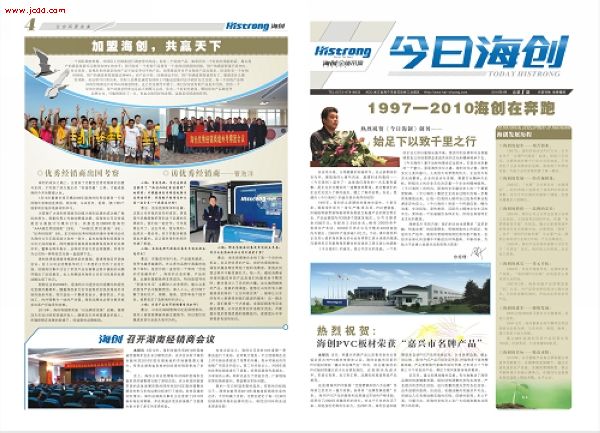 《今日海創(chuàng)》定性為季刊,每個(gè)季度的第二個(gè)月初出版,分為四個(gè)版面報(bào)紙?jiān)诿嫦?/SPAN>經(jīng)銷(xiāo)商和消費(fèi)者提供公司產(chǎn)品介紹的同時(shí),也會(huì)采納讀者的建議和意見(jiàn)不斷完善報(bào)紙的內(nèi)容和版面