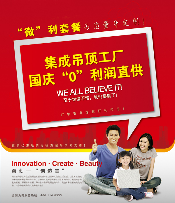 在國慶活動期間,海創(chuàng)集成吊頂全國近600家專賣店將共同參與本次活動,聲勢之大。高品質(zhì)的第四季新品特惠,豐厚的套餐,奢華的水晶燈,還有超值大禮相送。海創(chuàng)集成吊頂帶您感受溫馨、時尚的生活空間,給您健康、舒心的產(chǎn)品體驗,讓您輕松擁有高端品牌。